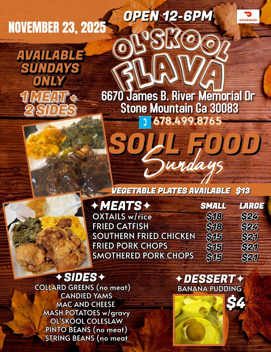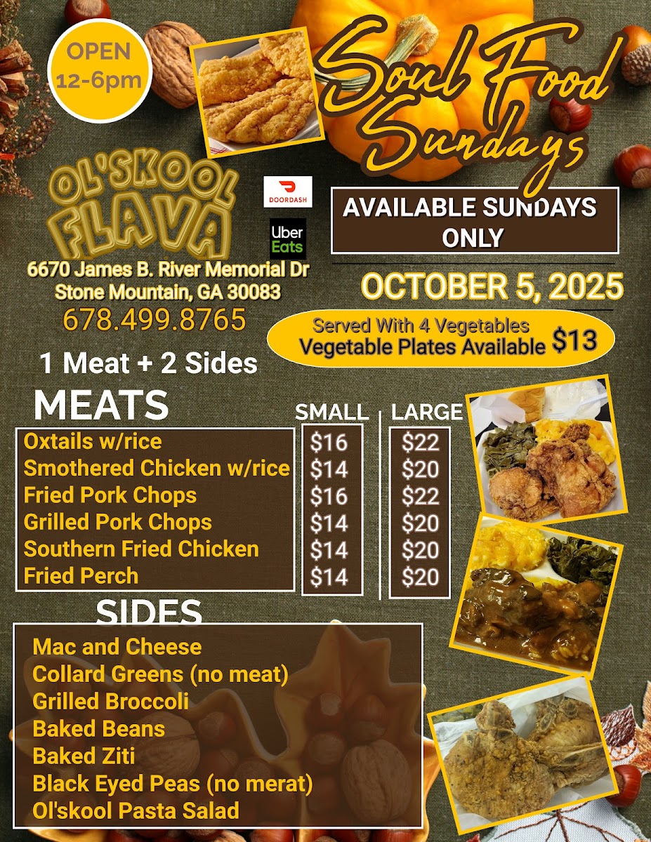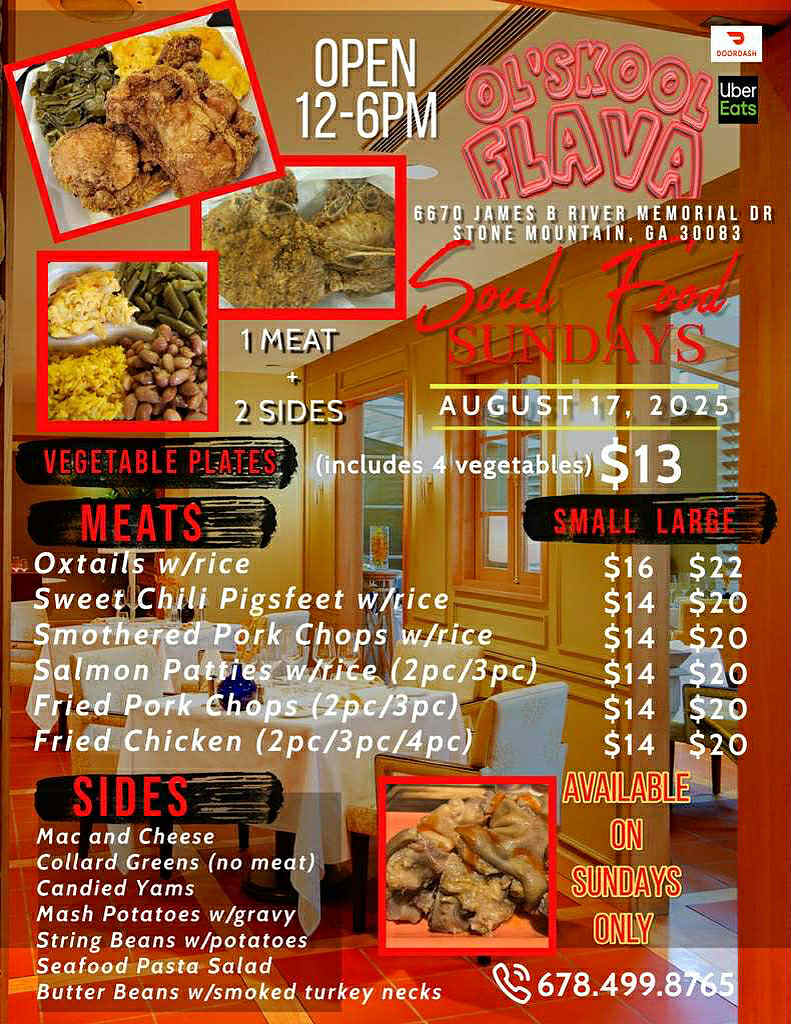 Ol'Skool Flava offers a menu rooted in comforting, family-style soul food, perfect for relaxed meals any day of the week. The selection is straightforward yet thoughtfully prepared, with dishes that invite sharing and savoring together. Whether you're stopping by for a hearty weekend lunch, an easy family dinner, or a casual catch-up with friends, the menu matches a warm and welcoming atmosphere.